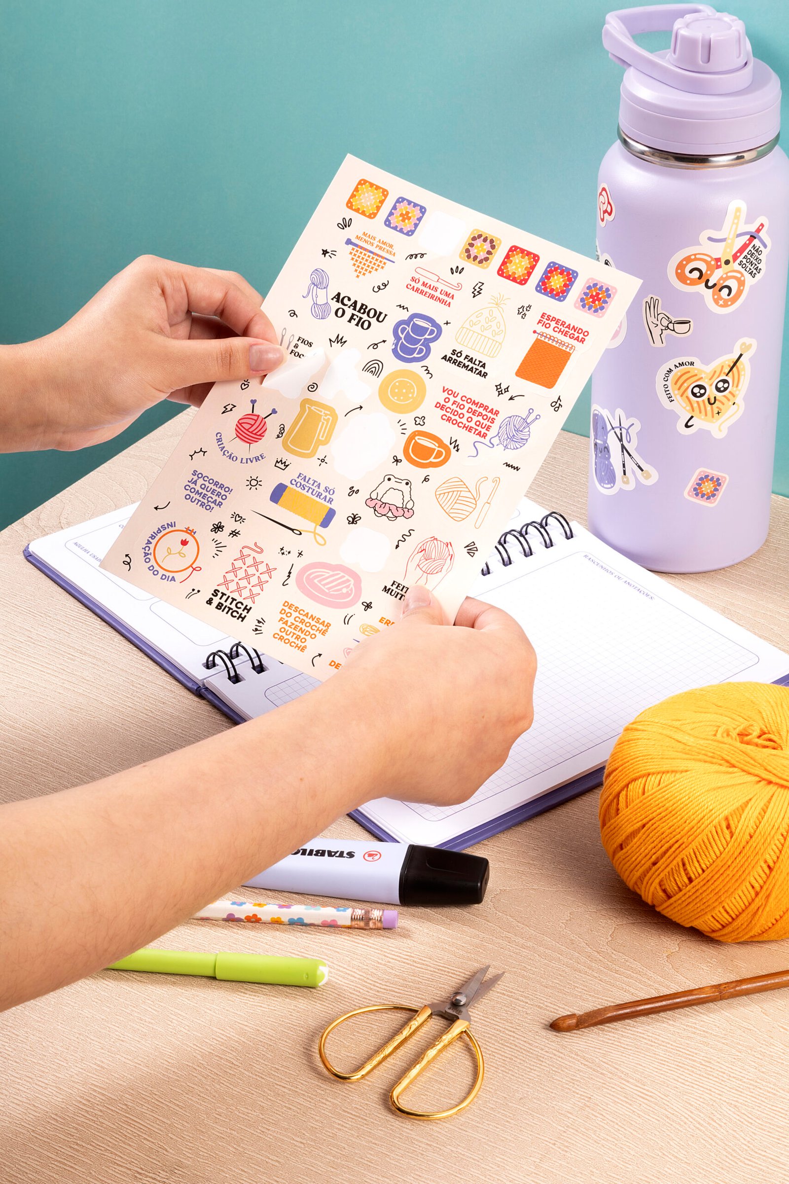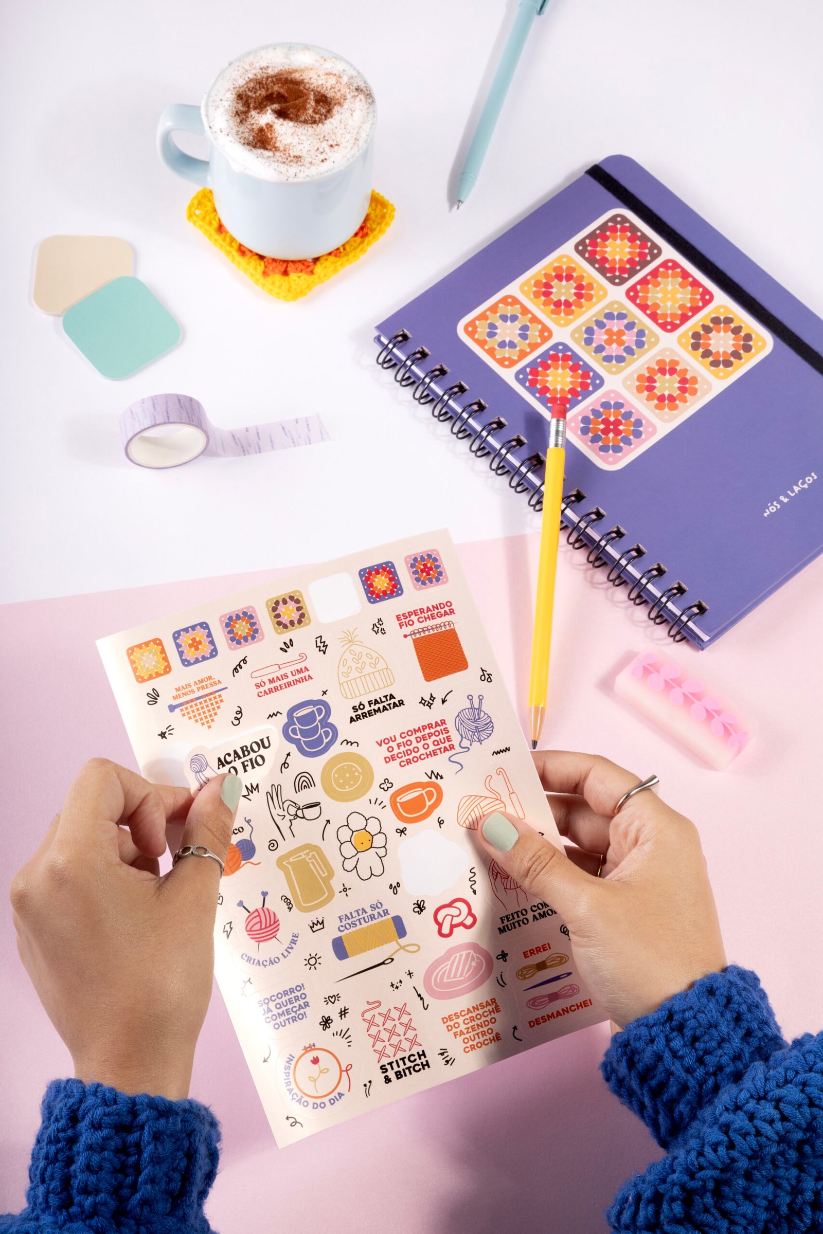 O Kit de Adesivos foi criado para acompanhar sua rotina criativa, com frases e ilustrações que traduzem o universo do crochê, da papelaria e do feito à mão.